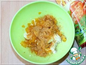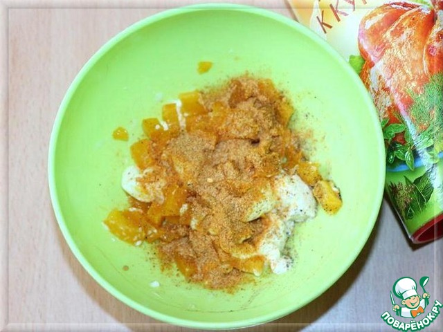• Пока варится фасоль, приготовим начинку для грудок. В миске смешиваем мягкий сыр и нарезанный небольшими кубиками сладкий перец. Добавляем приправу для курицы, перемешиваем.