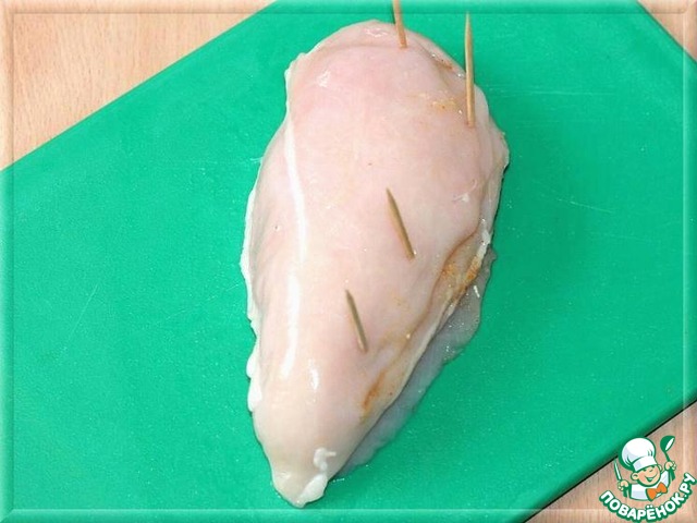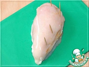 • Накрываем и закрепляем края филе зубочистками. Фаршированные грудки солим, перчим с обеих сторон. Когда переворачиваете на сковороде грудку, зубочистки снимаете.
