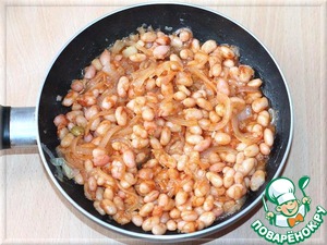 • Выкладываем в сковороду фасоль, добавляем 1 ст. л. томатной пасты, щепотку молотого перца, немного сахара (по желанию), солим и хорошо перемешиваем.