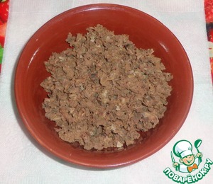 Печень отварить в подсоленной воде до готовности, остудить. Перекрутить на мясорубке.