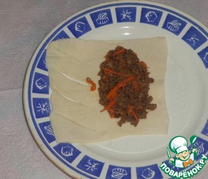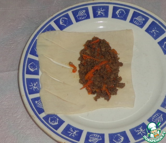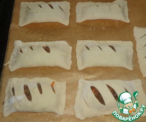 Тесто разморозить, раскатать в пласт и нарезать на прямоугольники. На одной половине прямоугольника сделать надрезы острым ножом. На другую часть теста кладем начинку и накрываем другой частью теста с надрезами. Края хорошо защипываем.