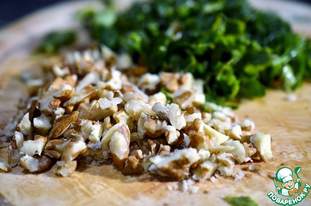 Посолить, поперчить, добавить пажитник (уцхо-сунели), перемешать. Засыпать орехи, кинзу и жареный лук.