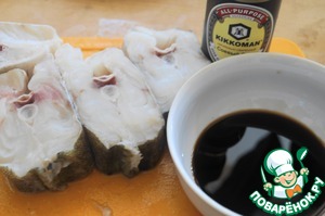 Сначала займемся рыбой. Для этого чистим ее от внутренностей и чешуи, затем промываем. Режем на куски (у меня получилось 4 куска). В чаше смешиваем соевый соус, лимонный сок и перец черный. Рыбу складываем в глубокую тарелку и заливаем маринадом. Оставляем минут 30.