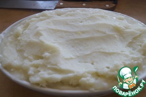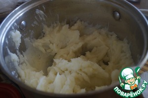 Готовый картофель превратим в пюре при помощи ступки, затем добавим сливочное масло и молоко, снова разомнем ступкой, можно взбить миксером. Добавим мускатный орех и перемешаем. Получится воздушное пюре.