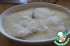 Теперь приготовим соус. Для этого нагреем в сковороде сливочное масло. Добавим лук и муку, немного обжарим, помешивая лопаткой. Теперь добавим уксус, сливки и воду, посолим и оставляет тушиться на 5 минут. Форму для запекания смажем сливочным маслом, выложим в нее маринованную рыбу и зальем сливочным соусом.