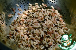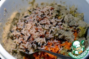 Посолить, поперчить чечевичную массу, добавить рис, половину обжаренной моркови и хорошо перемешать.