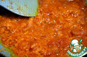 Добавить в оставшуюся морковь томатную пасту, воду, чтобы получилась консистенция сметаны.
