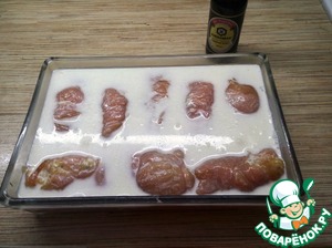 У меня были грудки с костью и кожей. Поэтому разделываем на филе, получается 4 куска филе. Дальше каждый кусок филе перерезаем вдоль на 2 пласта. Итого у нас получается 8 пластов.