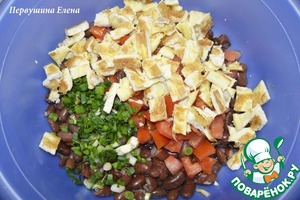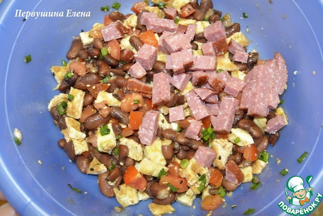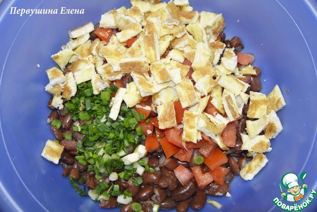 Описание: Довольно вкусный и пикантный салатик получается. Отличное сочетание упругой фасоли и нежного омлета.