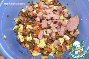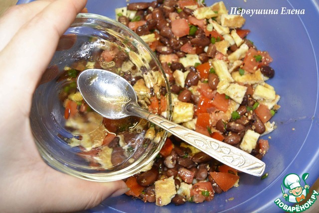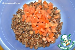 Соединить фасоль с помидорами, которые нужно порезать кубиками. |