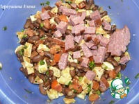 Остывший омлет нарезать кубиками и вместе с измельченной зеленью положить в чашку. |