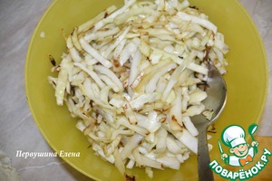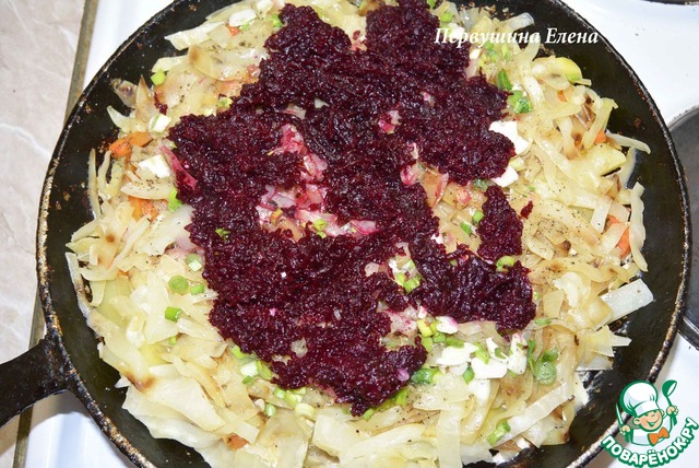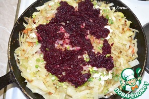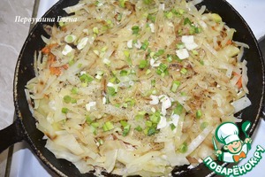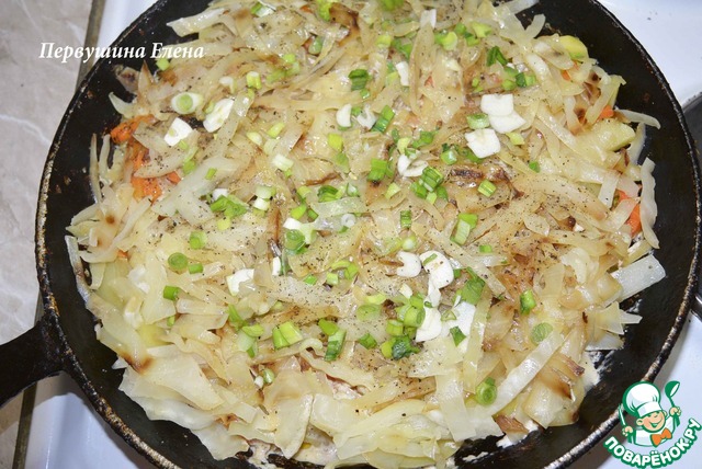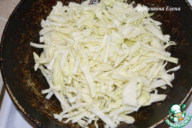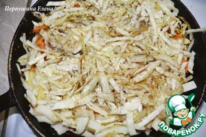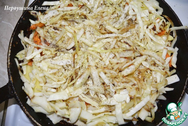 капусту. Посолить и поперчить слегка. Капуста с морковью будет тушиться на пару. Если мы нальем жидкости больше, чем нужно, то пока картофель с мясом сварятся, капуста будет слишком мягкой. А она должна слегка хрустеть.