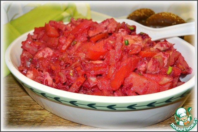 Предлагаю вашему внимаю сытное, очень вкусное, с легким сливочным вкусом блюдо из куриного мяса и овощей. Цвет рагу получается ярко-розовым, что не может не радовать глаз!