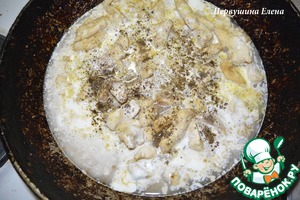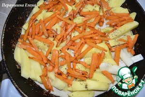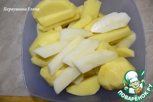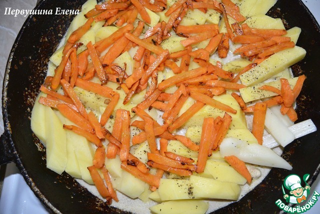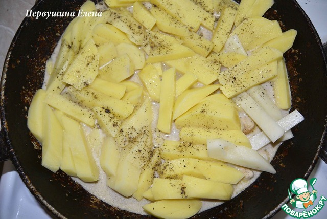 Выложить картофель. Слегка посолить и поперчить. Получится, что картофель погрузится наполовину в жидкость. А дав при варке свой сок, очутится полностью в жидкости и хорошо сварится.