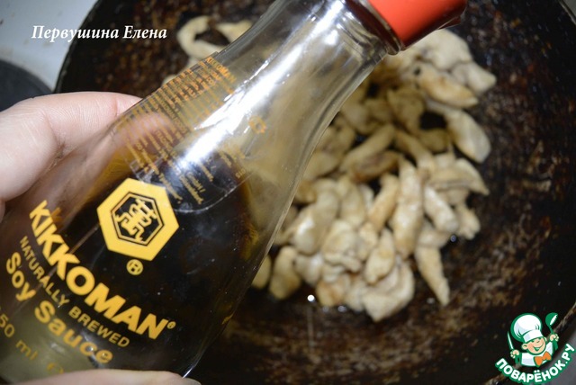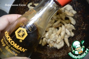 Выложить мясо в сковороду и вылить на него соевый соус,
