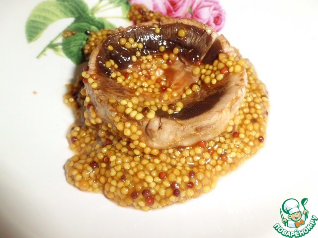Шляпки грибов оставляем на несколько минут в смеси горчицы и соевого соуса.