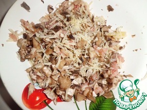 Ножки от грибов мелко нарезаем, добавляем к ним мелко нарезанную рыбу, сыр. Перемешиваем.