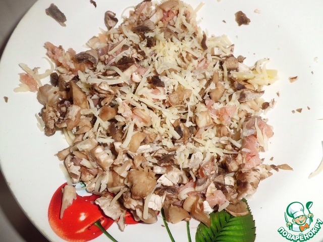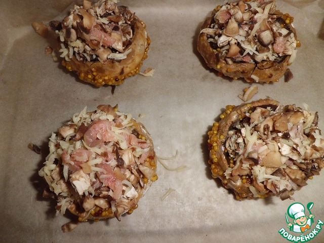 Заполняем шляпки начинкой и отправляем в разогретую до 220* духовку, на несколько минут (10-15 не больше, ориентируйтесь по вашей духовке).