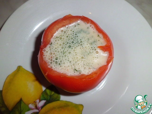 Заливаем получившуюся смесь в помидор и отправляем на 2 минуты в микроволновую печь (мощность ок. 700).