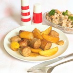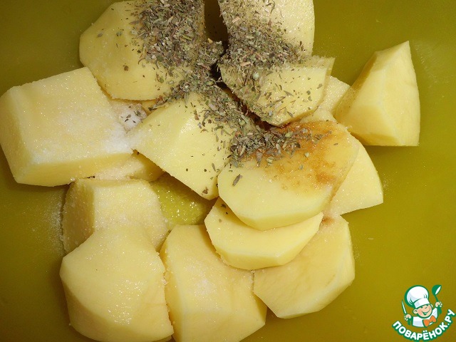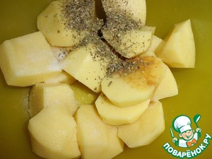 Картофель чистим, нарезаем крупным кусками. Добавляем соль, оливковое масло, специи, соевый соус - перемешиваем. -