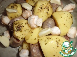 Выкладываем в жаропрочную форму половину картофеля. Сверху выкладываем нарезанные колбаски, половину чеснока и грибов.