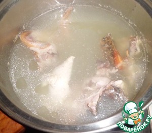 Извлекаем из бульона курицу, отделяем мясо и возвращаем мясо обратно. Добавляем перловую крупу (если вы готовили её отдельно), зажарку.