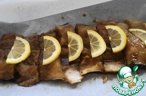 Расстилаем бумагу для выпечки на противне и выкладываем кусочки рыбы, поверх раскладываем кусочки лимона и заворачиваем пергамент. Ставим запекаться в разогретую до 180 градусов духовку на 20 минут.