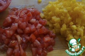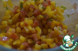 Пока запекается рыбка, приготовим сальсу. Мелкими кубиками режем перец и помидор. Мелко режем лук и рубим зелень петрушки.