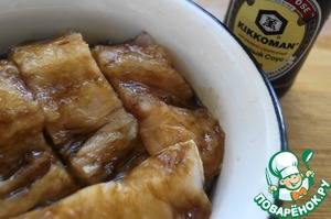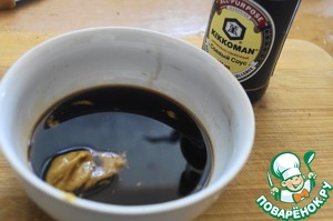 Подготовим маринад: в чаше смешаем соевый соус, мед и горчицу, немного посолим и хорошо размешаем до однородной консистенции.