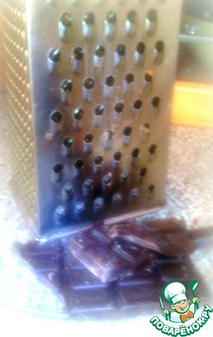 Подготовим начинку. Если у вас замороженная вишня, то добавить сахара, если она кислая (можно немножко её поварить до растворения сахара). Я использую бабушкино вишнёвое варенье (ягоды цельные, без косточек). Натираем плитку шоколада на крупной тёрки.