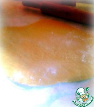 Достаём наше тесто и делим его примерно так: одна половина немного больше второй. Большую половину раскатываем скалкой так что бы тесто не было слишком тонким.