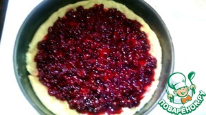 Переворачиваем нашу форму и смазываем растительным маслом. Кладем на дно формы тесто приминая кроя, что бы начинка потом не вылилась. Выкладываем вишню на тесто.