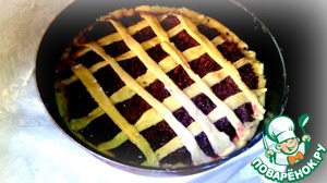 Собираем обрезки и раскатываем. Нарезаем полоски и поверх всего раскладываем как решётку. Отделяем из 3 яйца белок от желтка. желтком смазываем решётки и ставим наш пирог в духовку на 30-40 минут при 180 градусов.