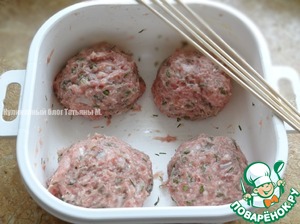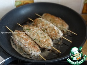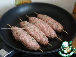 Нанизать фарш на шпажки, распределить, выложить на смазанную маслом сковороду;
