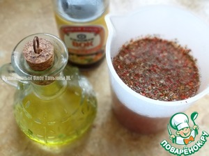 Томатный порошок развести в воде (можно заменить натуральным томатным соком), добавить соль, травы, соевый соус, масло;