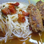 Свиные кебабы с зеленью под томатно-соевой подливой с луком, черри и итальянскими травами. Очень вкусно, рекомендую!
