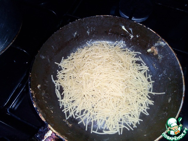 Тем временем беру лапшу-паутинку и не много ее прожариваю на сковородке. Это позволяет на второй день ей не раскисать и дает пикантный вкус.