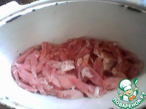 Укладываем в сковороду или в форму для запекания слоями. С окорочка острым ножом состругать мясо. Это будет первый слой