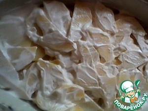 Затем посыпать сыром и помазать майонезом. (у меня сыра не было, и я сделала без сыра, тоже получилось вкусно) Запекать в горячей духовке в течение получаса.
