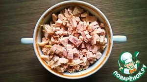 Курицу сварить и порубить. Можно использовать мясо запеченной или копченой птицы.