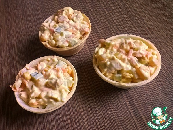 В качестве заправки можно использовать сметанно-горчичный соус, майонез или сырный соус. Подавать в тарталетках.