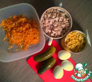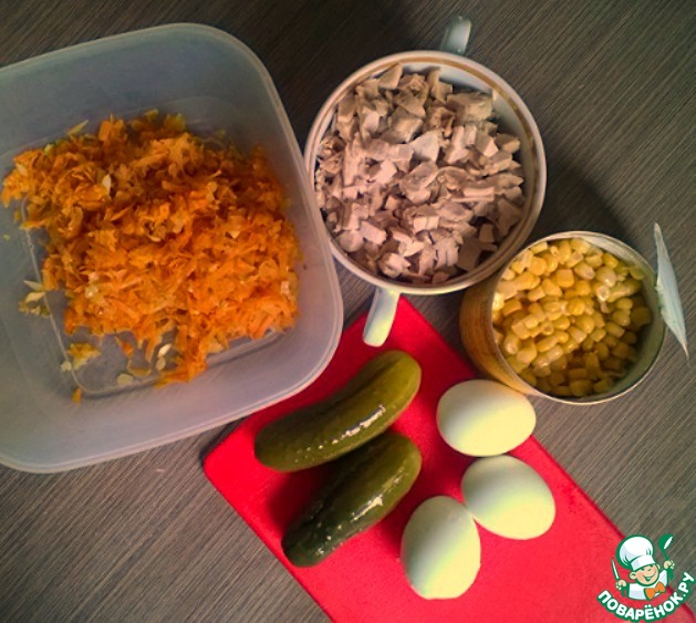 Сварить и измельчить яйца. Нарезать огурцы. Смешать с курицей, морковью и луком, кукурузой.