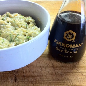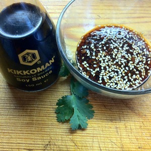 Для соуса смешать с соевым соусом Киккоман измельченный чили, сахар и семена кунжута.