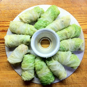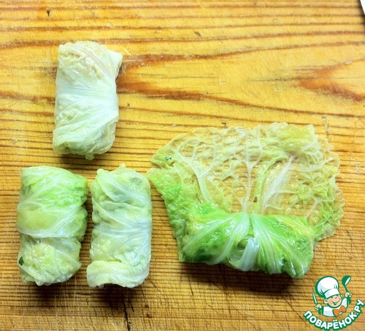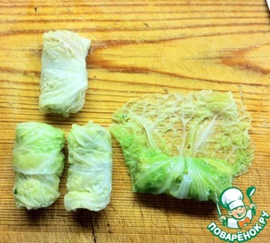 На каждый лист капусты выложить чуть больше чайной ложки фарша и свернуть маленькие голубцы.