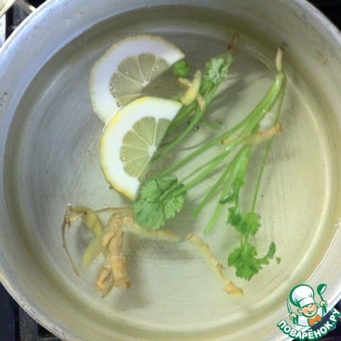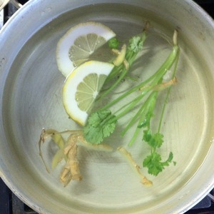 В воду для пароварки положить кожицу имбиря, стебли кинзы и кружок лимона.