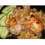 Смешать в блендере мясо с бёдрышек, лук, листья кинзы, очищенный имбирь, чеснок, сок и цедру лимона, чили и соль.