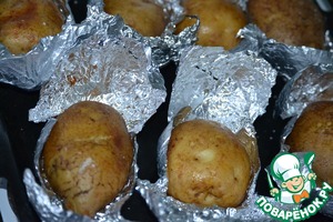 Про рульку теперь вспомним, когда нам надо будет ее запекать. Поэтому поговорим о гарнире. Не знаю, может повторюсь с таким картофелем, но специально нигде не читала ничего, придумала по ходу пьесы из того, что было в наличии. Итак, берем молодой картофель примерно одинакового размера, хорошо моем, обсыпаем немного крупной солью и немного растительного масла. Заворачиваем каждую индивидуально в фольгу и ставим запекать в духовку, минут 40-50 ( у меня крупноватый картофель был), готовность проверяю вилкой.
