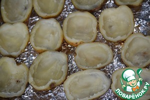 Запеченный картофель режем на половинки и вынимаем серединку, получить должны вот такие лодочки.