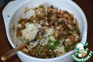 Обжариваем на растительном масле до золотистого цвета лук и грибы, картофель превращаем в пюре, добавляем 2 ст. л. соевого соуса Kikkoman, лук с грибами, зелень петрушки и укропа, сметану, соль по вкусу и хорошо перемешиваем.