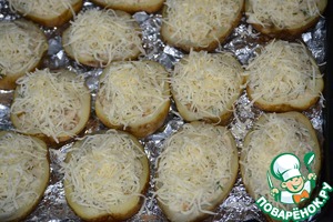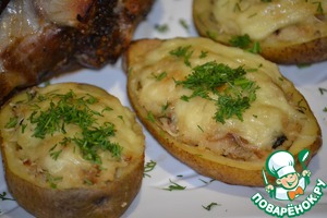 Теперь начиняем половинки картофеля получившимся фаршем, сверху посыпаем натертым сыром и оставляем пока.